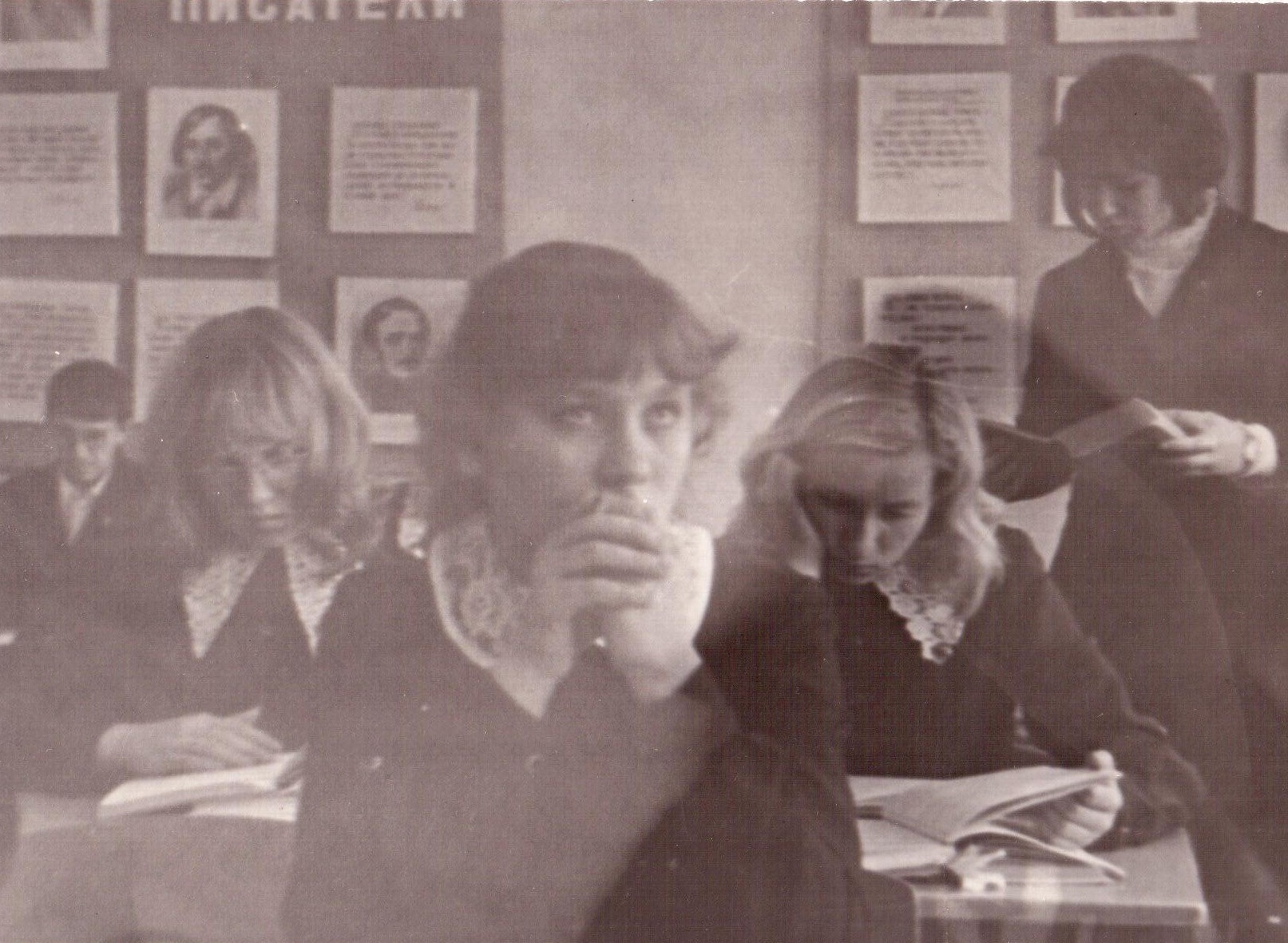 Урок литературы. Сидят: Хомякова Т., Герасимова Т., Бугранова Т., Хаиров Р., стоит Червонюк Л.